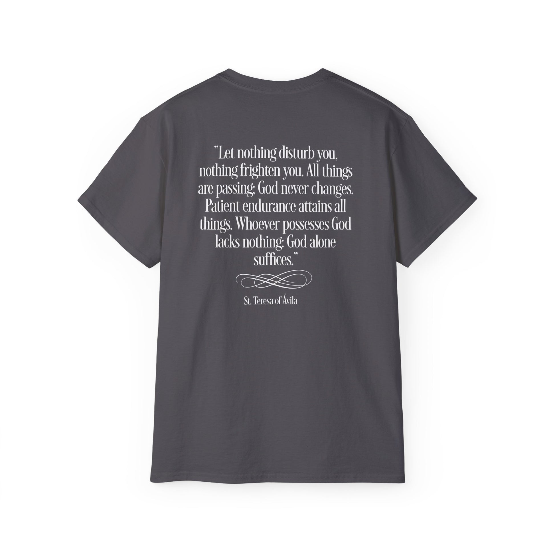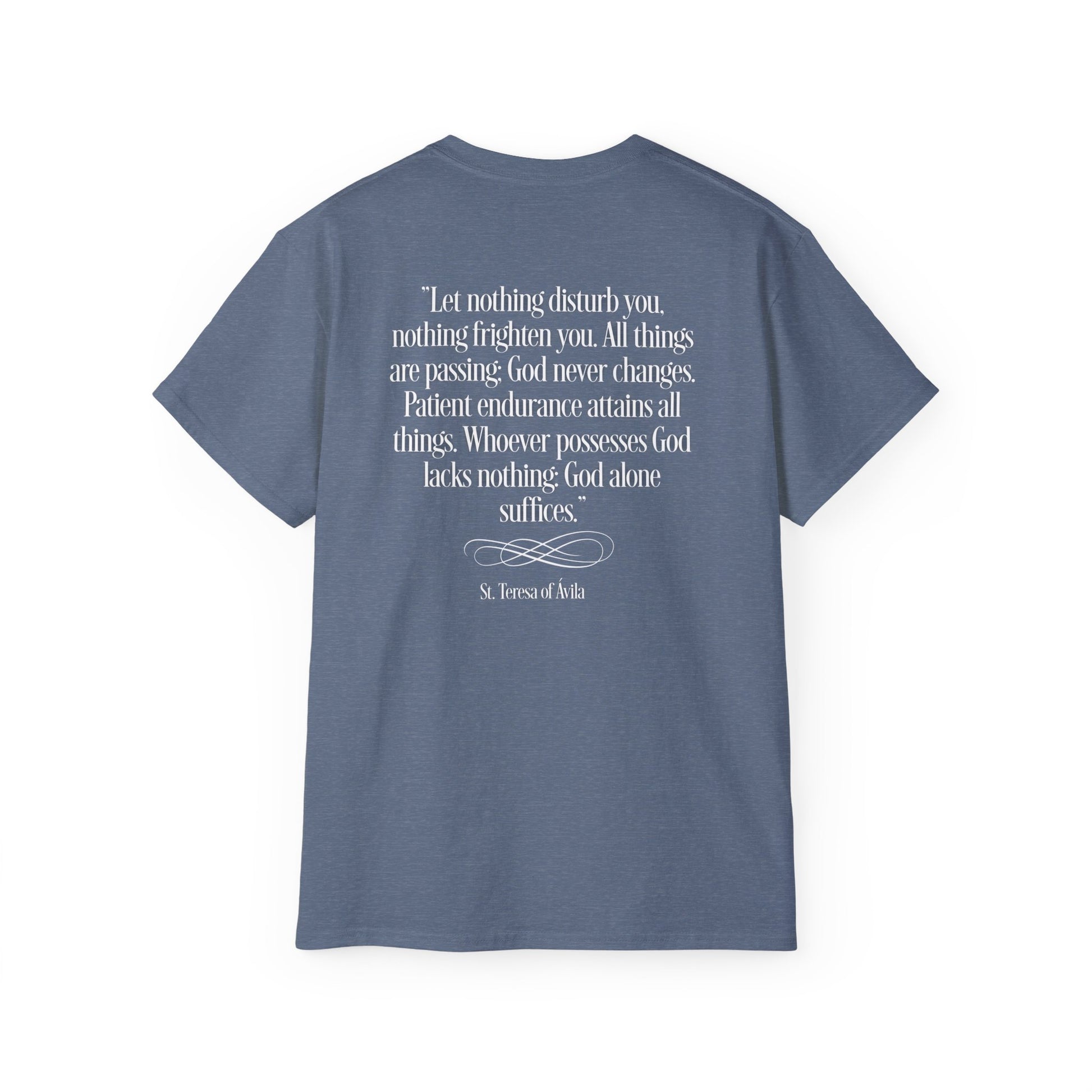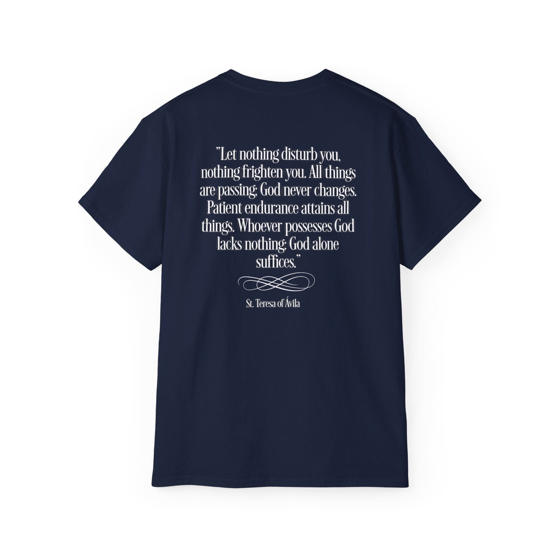 A comfortable and versatile t-shirt featuring an image and quotes from St Theresa of Avila. Perfect for those seeking a spiritual and inspirational touch to their everyday wardrobe. Ideal for adults looking for a unique and meaningful piece of clothing. Relevant for religious holidays and special occasions.